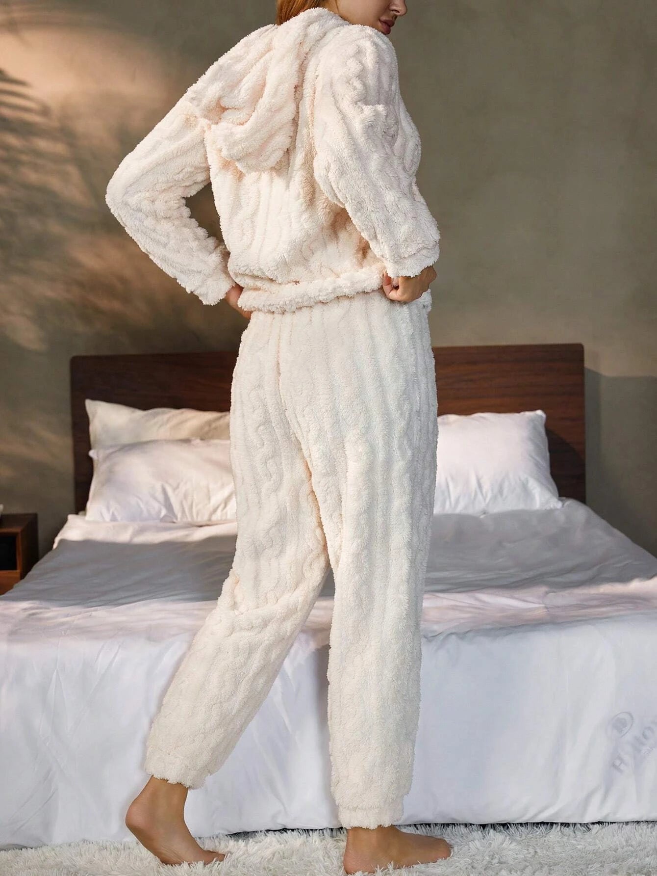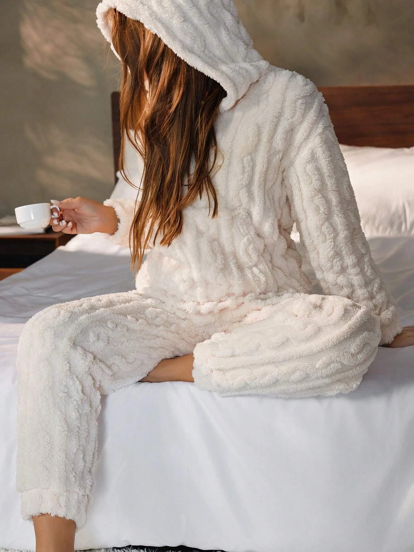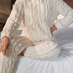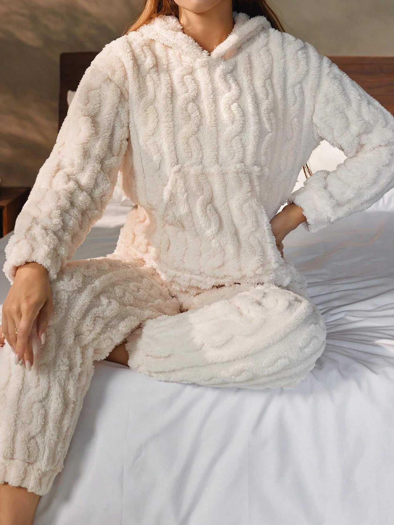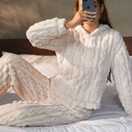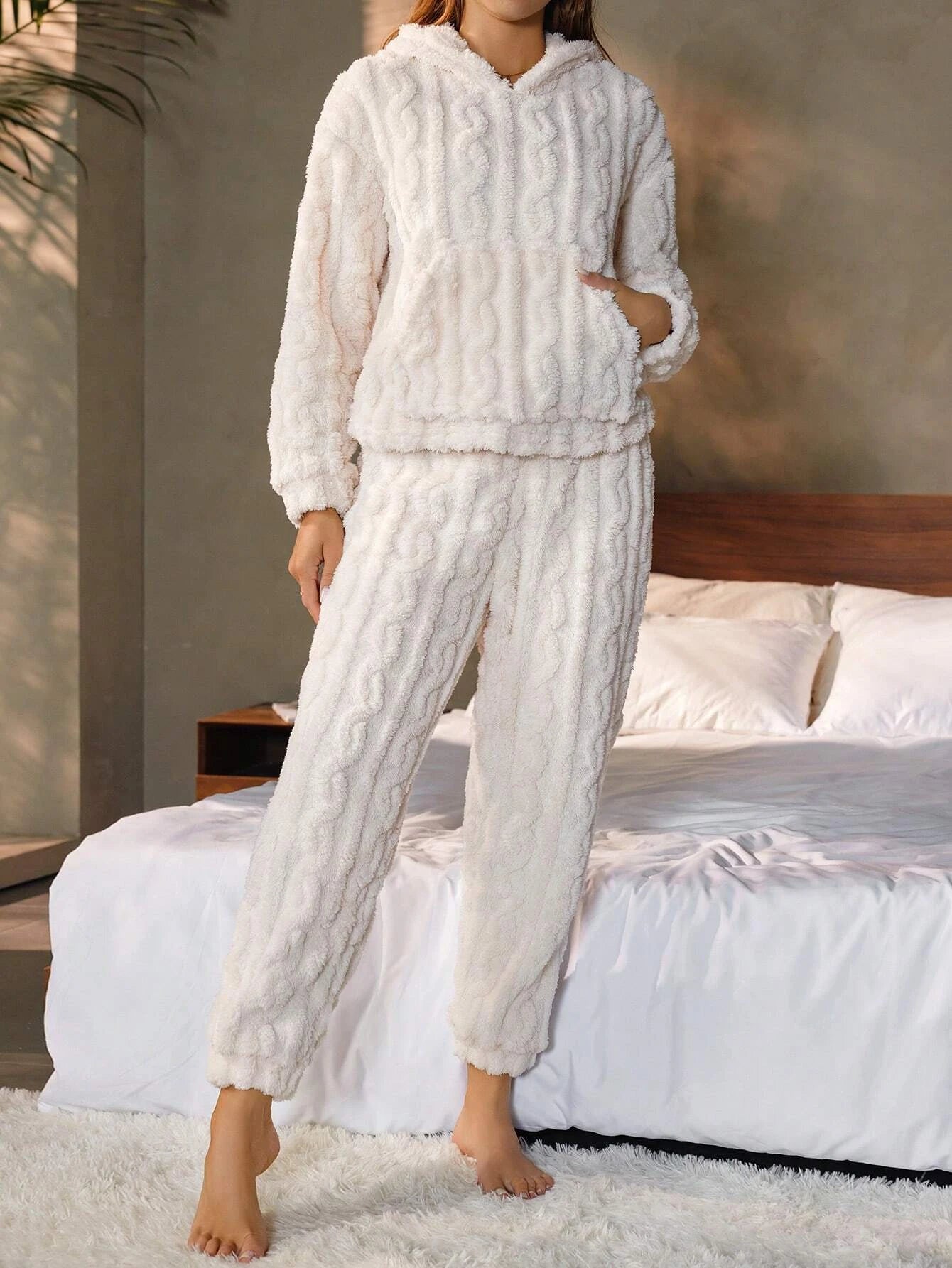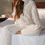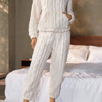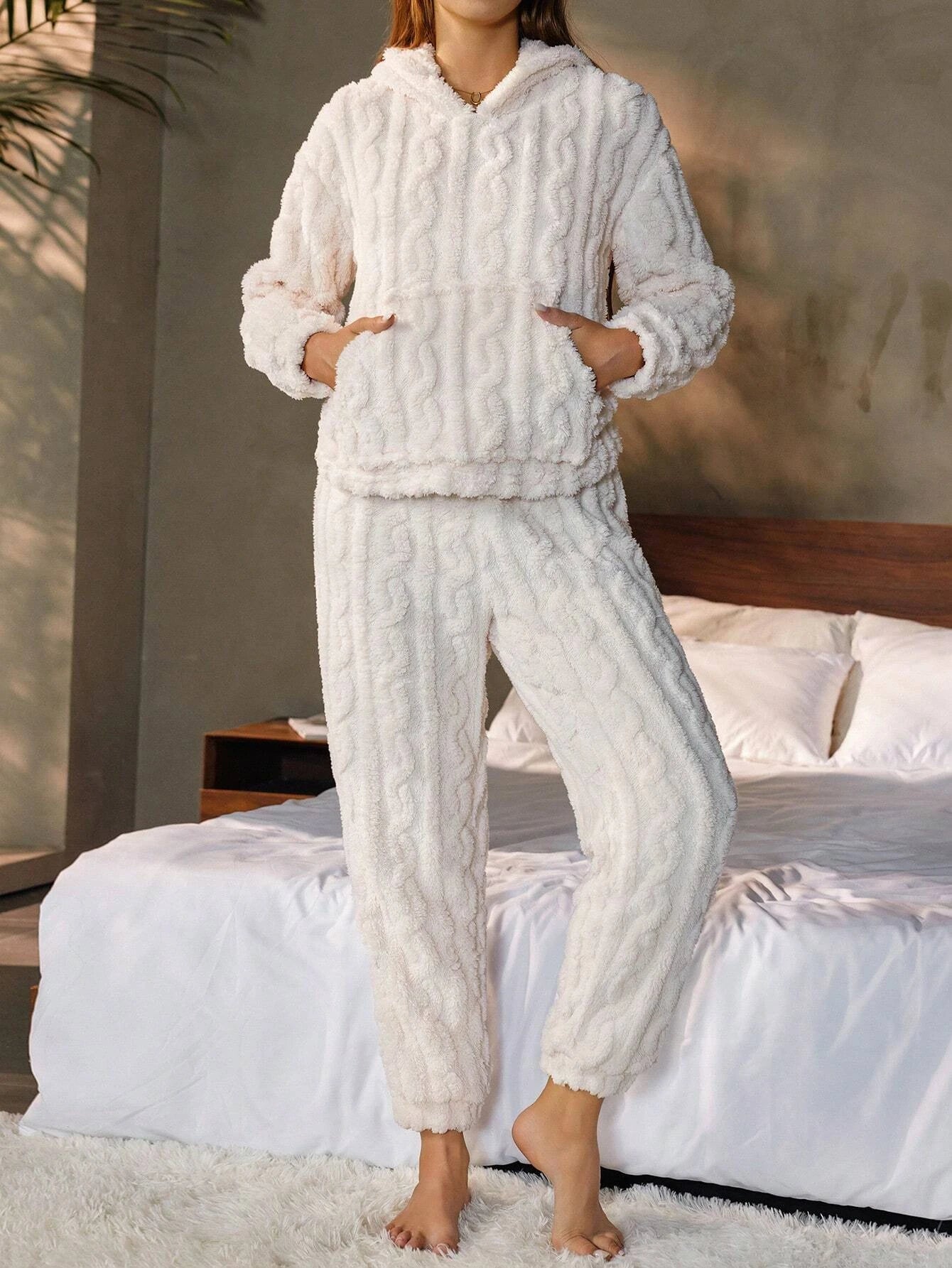 Crafted from a soft, plush knit fabric, this pajama set features a relaxed hoodie top and matching pants, perfect for lounging or a good night’s sleep. The elegant textured design adds a touch of sophistication to your loungewear, making it not only cozy but chic. Designed with an easy, flattering fit, it’s perfect for cool nights and lazy mornings.