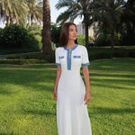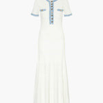 Our Sandra Maxi dress in decorative knit with frayed denim inserts, a round button-down collar, short sleeves and two patch pockets at the chest.